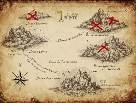 Voici un bout de la Carte aux trésors. Cinq îles, des chemins secrets… et des réductions disséminées dans la boutique. Ouvre l’œil, suis les indices et trouve le butin !